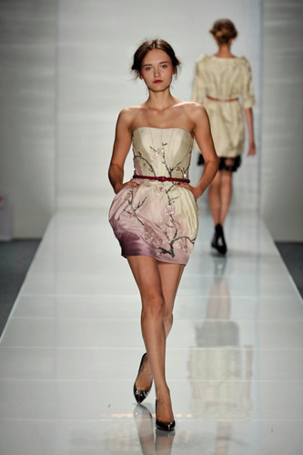 诗,源于情、兴于美、盛于唐,全盛时期的山水田园诗蔚然大观,借助思维进行虚拟的想象旅行,常呈现出“诗中有画、画中有诗”隽逸灵秀的诗境引人入胜。崔护的一首《题都城南庄》“去年今日此门中,人面桃花相映红。人面不知何处去,桃花依旧笑春风。”更是如此。这次秀“人面桃花”正是以本诗为背景展开,色彩以桃红、鹅黄、玫红协调灰、白、金等,染织传统面料,绣画09春夏。