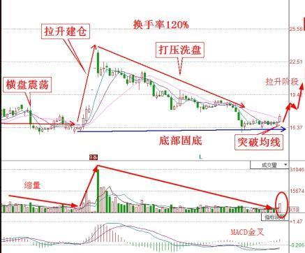股价从15年跌到底部后,出现缩量横盘震荡,是因为主力吸筹,但因为散户深套不卖,无法大量吸筹。所以有了上涨30%的拉升建仓。为什么是建仓而不是拉升派发呢?因为主力坐庄成本至少要20%左右,怎可能冒大风险赚10%就走!所以之后主力打压洗盘并吸筹,清洗获利盘和套牢盘,从换手率120%看出已经建仓完毕。均线多头排列和MACD金叉走强,都说明多头趋势形成,主升浪即将启动。