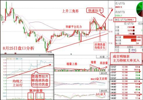 该股股价大幅下跌在底部企稳。形成明显的“上升三角形”看涨形态,其中持续缩量上涨,不是滞涨就是主力重仓持股,高度操盘。在底部何来的滞涨呢?所以是主力操盘拉升。股价突破平台后回调洗盘,缩量说明获利盘出局和筹码趋于稳定。目前再次价涨量升,macd金叉在即,kdj金叉,而且股价受5日均线支撑,均线多头,说明上涨趋势形成。