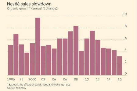 今年2月,雀巢公布了2016年财报,这份财报显示雀巢盈利弱于预期,且一项重要的销售指标也大幅下降,这凸显了消费品公司在关键市场经济增长迟滞和低通胀环境下所面临的挑战。