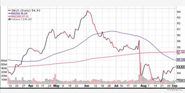 下图是关于星巴克股价自2017年4月13日到9月1日的股价走势曲线(红色和蓝色结合曲线)和50日移动平均线(蓝色曲线)及200日移动平均线(红色曲线)。