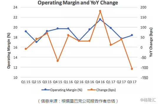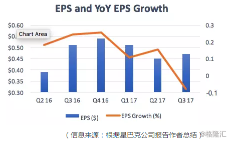 下图系巴克公司从2016年第二季度到2017年第三季度每股盈利和每股盈利同比增长变化: