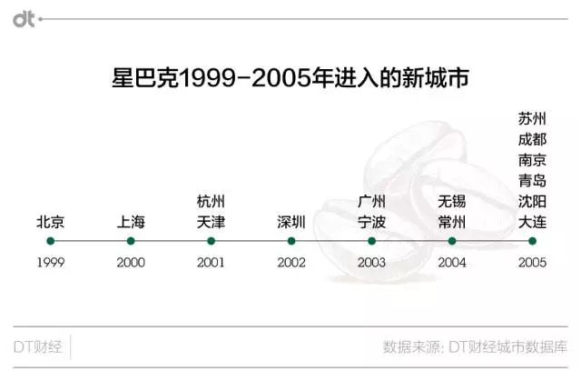 2005年之前,星巴克进入新城市的动作非常保守,每年在单个城市新开的店面数不会超过个位数。这一阶段,入驻城市的顺序就很值得咀嚼,这包含了星巴克在十几年前对一个城市商业文化、接受新事物程度的判断。