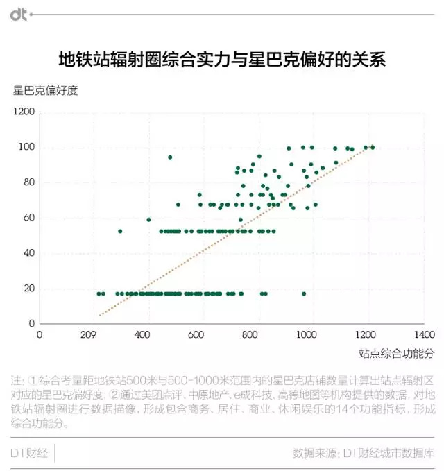 为了方便说明与理解,DT君在接下来的分析中以地铁站点作为观察坐标,来指代城市中具体的区域位置:一方面,在地铁成为路网重要节点的一线城市中,地铁站点辐射圈差不多能覆盖全部重点区域;倒过来看,地铁辐射圈也确实包含了绝大多数的星巴克店铺,分析它们足够说明问题。