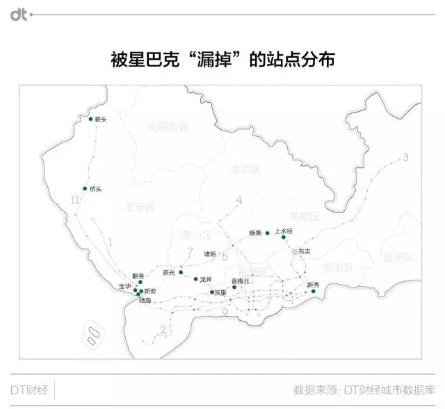 福田、市民中心与少年宫被星巴克宠爱的程度直逼市中心,它们都是深圳中央商务区(CBD)的一部分,钢铁森林里囤积了大量金融从业者;而科苑、高新园等站点相比就不那么被重视,它们镇守科技园,周边公司人多擅长科学技术。两类站点被区别对待,只能让DT君大胆猜测,大概是商业力量认为这两类公司人在消费习惯、消费能力方面有很大差异吧。