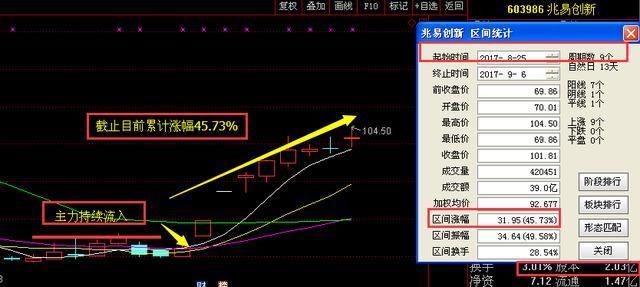 兆易创新同样是通过此方法选取出来,选取出后后股价进入了快速拉升达到目前最高价104.50,9天累计涨幅45.73%。这套选股思路就是这么简单,就是这么牛,如果你还没抓到这样的短线大牛股只能说你还没有多看本人的专栏,还没有学会这套选股思路了,想学习的可以去我专栏中查看!