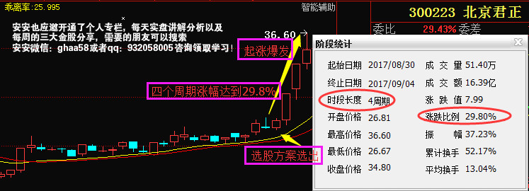 我们在来看看第二只北京君正,北京君正安安通过选股方案选出,选出后就是持续的上涨,截止目前,四个周期涨幅达到29%。如果,你在30日有看到本人的专栏,学会了这套选股发案,那么这29%个点的盈利是不是能把握在手了?