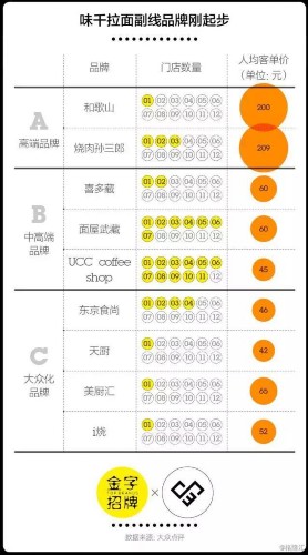 从价格上看,副线品牌可以分为高端、中端和大众品牌三个层次,涵盖了烧烤、日料和咖啡店这三大品类。据网络资料统计,高端品牌的两家分别是开在香港的和歌山和在上海的烧肉孙三郎,人均客单价在200元以上。中端品牌以拥有11家门店的UCC Coffee Shop和拥有7家店的面屋武藏为代表,客单价均在65元左右。而大众牌的客单价和味千拉面相当,有东京食尚、天厨、美厨汇和i烧四个品牌。