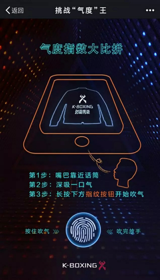 挑战开始后,按住画面中的按钮并对着手机话筒吹气,吹完放手。吹气时间越长,你的气度值就越高!还可以邀请好友参加气度PK!一起挑战全国的气度排行,看看谁才是中国的气度王!