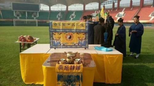 河南建业和山东鲁能泰山球员在球场上拼搏,场下另一场斗法在开展。先是河南建业请了十几位大师在航海体育场举行了隆重的祈福仪式,期望天意建业必胜。