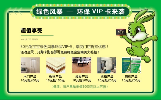 “50元兔宝宝绿色风暴环保VIP卡”,享最高抵900元优惠!