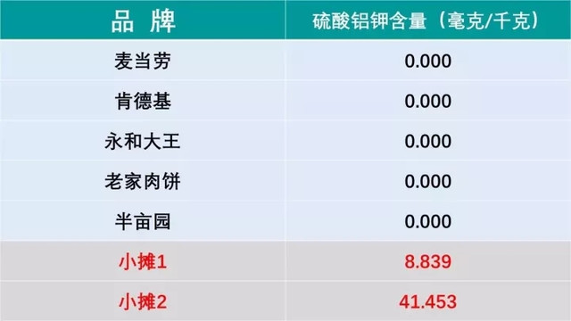 记者了解到,永和大王自称“非矾油条”,肯德基自称“安心油条”,在本次检测中均名副其实。而来自两个路边摊的油条均被检出含铝,含量分别为8.839mg/kg和41.453mg/kg,但均未超过国家标准规定的100mg/kg。