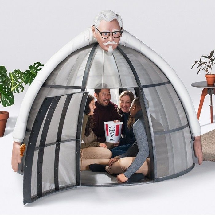 无论是谁,第一眼看到这顶帐篷时都会觉得它的确「与众不同」,甚至有些「奇葩」。帐篷本身并不大,但顶部却趴着一个「慈祥的」肯德基爷爷(创始人哈兰·山德士上校),四肢延伸到帐篷底。