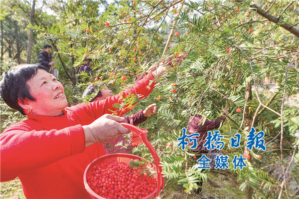 前段时间,位于稽东镇龙东村一带的浙江裕田红豆杉科技有限公司的万亩红豆杉基地——仙霞红豆杉景区,进入红豆杉果采摘旺季,来自上海、杭州和绍兴周边地区的游客络绎不绝,基地每天都要雇用四十五个本地劳动力上山采摘。村民们为基地采摘红豆杉果,每天可以赚百来元的工资;游客们则在观赏休闲之余,向基地购买红豆杉果,价格在三四百元一斤。