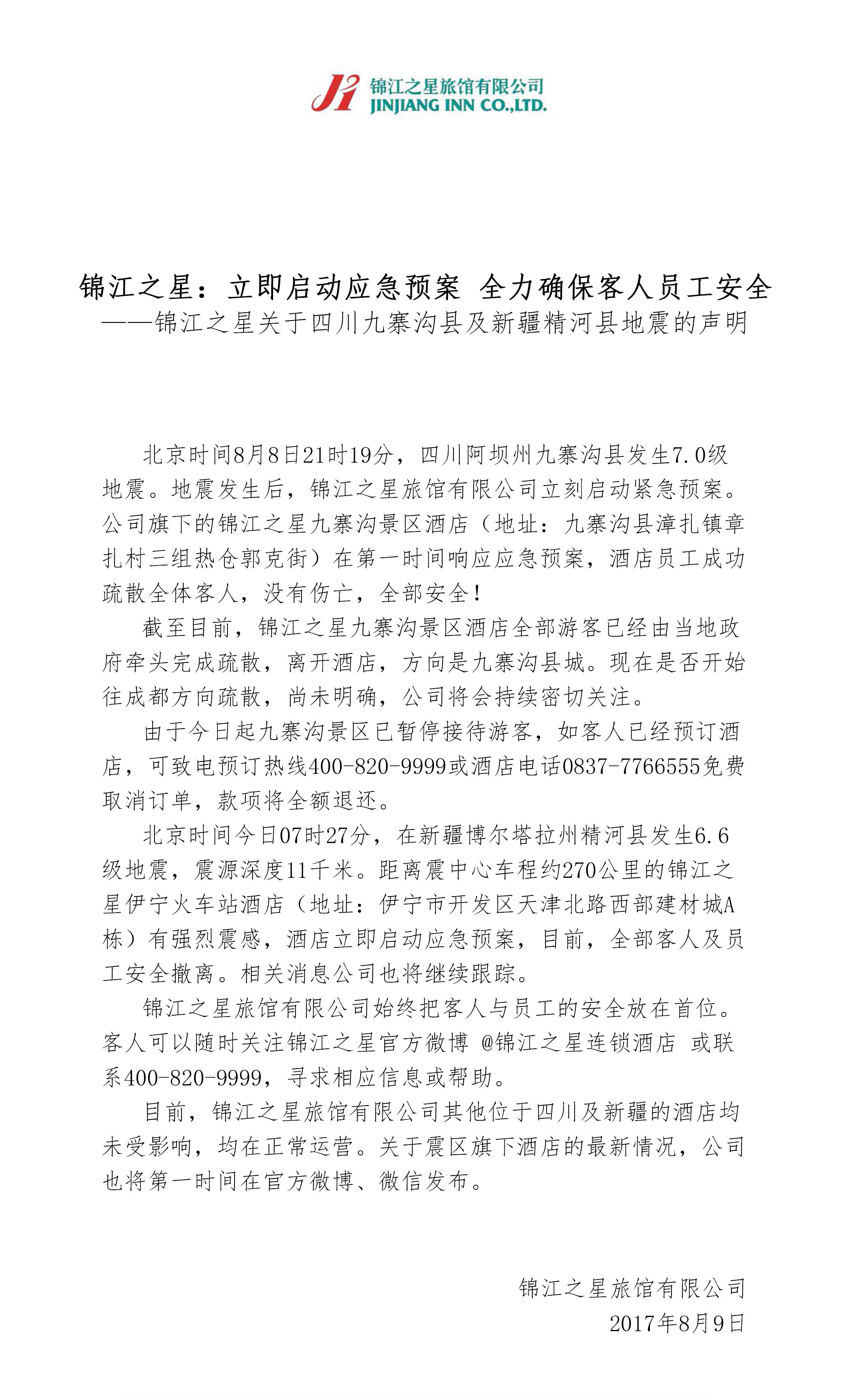 锦江之星关于四川九寨沟县及新疆精河县地震的声明
