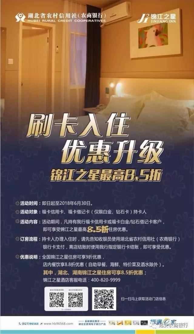 原标题:8.5折来啦!优惠入住锦江之星酒店 活动时间:即日起至2018年6月30日 活动对象:福卡信用卡、福卡借记卡(仅限白金、钻石卡)持卡人 活动内容:活动期间,凡持有我行福卡信用卡或福卡白金、钻石借记卡客户,即可享受锦江之星最高8.5折住房优惠。返回搜狐,查看更多 责任编辑: