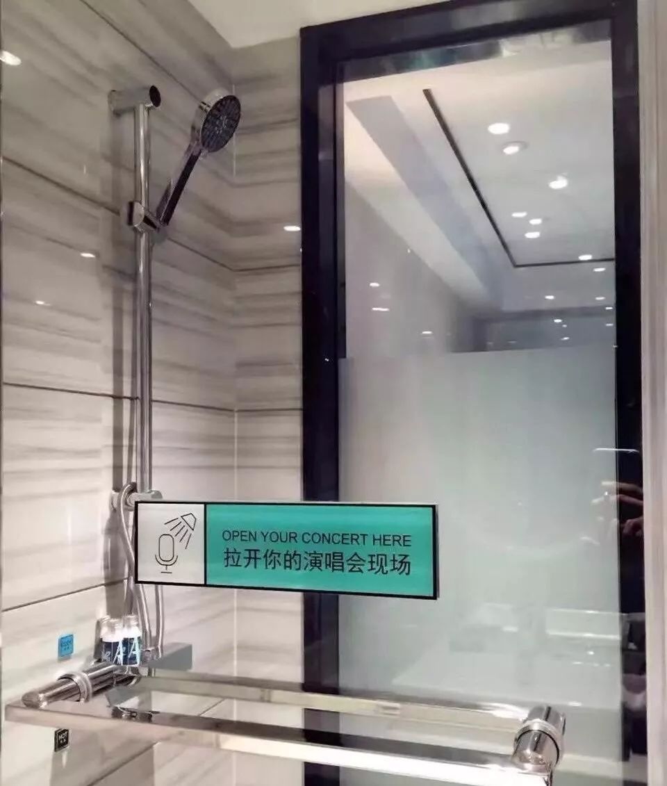 亮点是酒店的文案很不错,卫生间里的文案细节大到淋浴间推拉门上关于演唱会的忍俊不禁,小到抽水马桶上提示不要摔倒的女神tips。