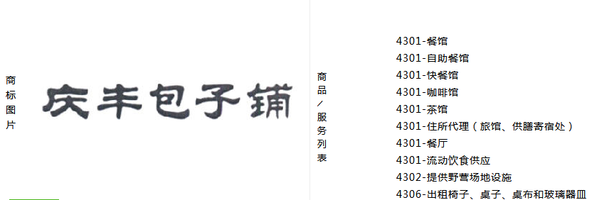 庆丰包子铺于1956年开业。在包子、馅饼等商品及餐馆、饭店等服务上,庆丰包子铺拥有“庆丰”商标、“慶豊”商标、“庆丰包子铺”商标。