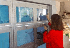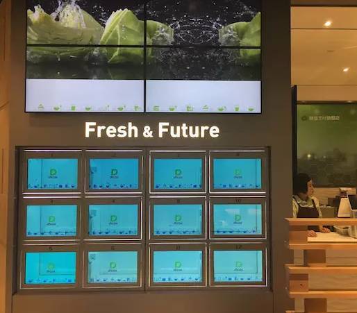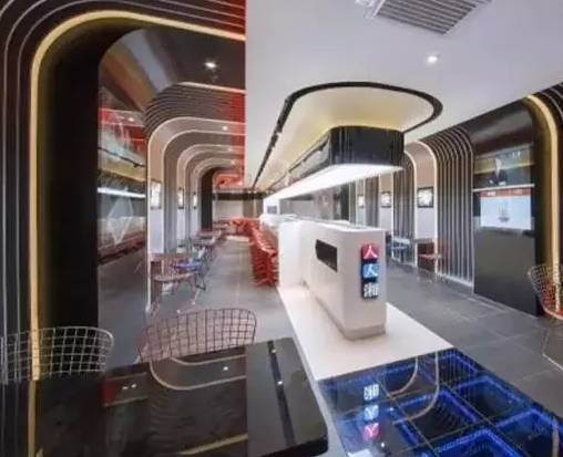 因为他是一家科技感知十足的“无人餐厅”所以他在设计装修上加入了很多具有科技感的装饰,比如我们取餐的“取餐窗口”他不再是常规店里的传统收银台,取而代之的是透明的取餐口。