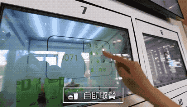 在这里,你就准备好手机扫描二维码,自助点餐,然后等待,餐好后手机订单会提示你,你根据手机上的验证码在透明的取餐窗口上输入密码,去取餐,然后开始用餐。