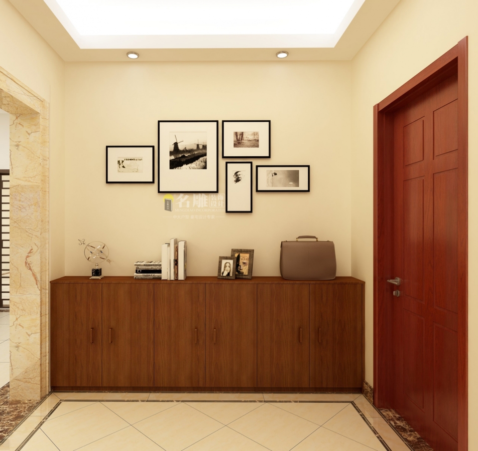 考虑到以后清洁的问题,鞋柜底下特别不镂空设计,背景加上组合画衬托得空间很精致,简介的天花而又大方,地面的波导线让空间更更有层次。