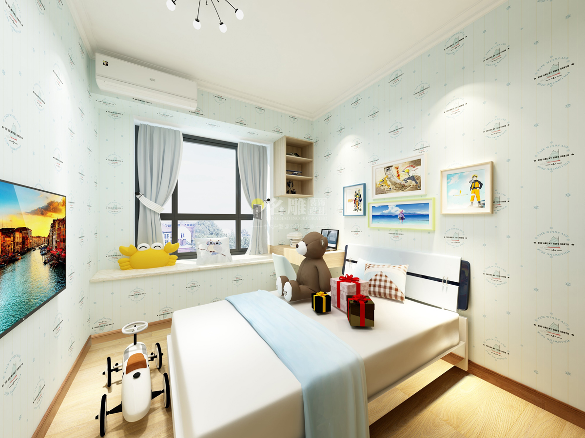 通过运用一些蓝色帆船墙纸来衬托出这个空间,原木色的木地板显得这个空间十分轻巧和带活力,再加上一圈简单的石膏线,精致的吸顶灯,让这房间变得更加有孩子朝气。