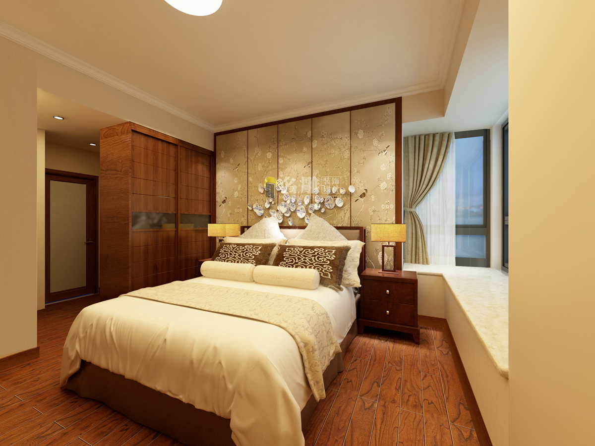 通过一个木线条框来衬托背景墙布的魅力,深沉的木地板颜色显得更加有品味。