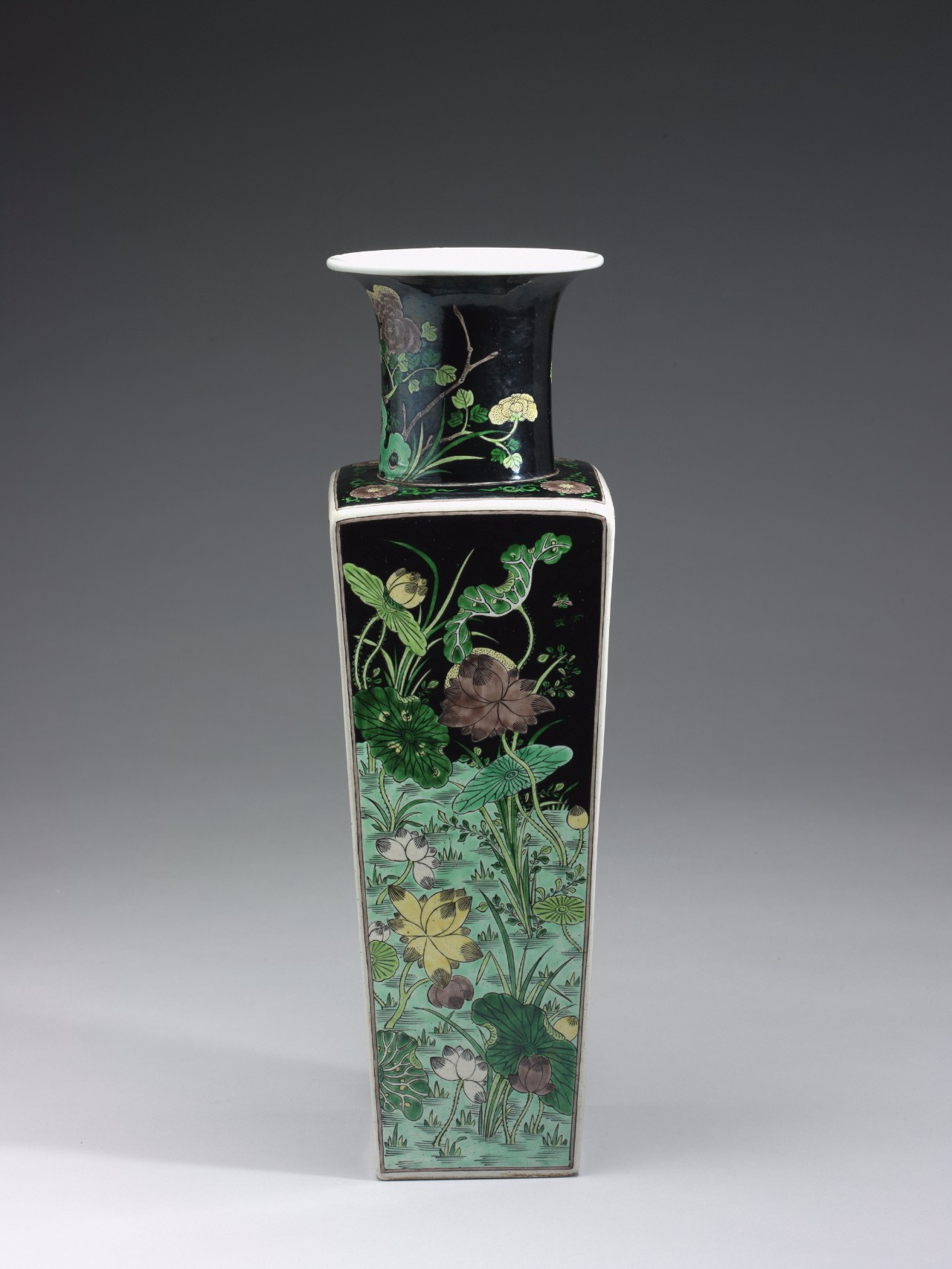 清康熙 墨地素三彩四季花鸟瓷方瓶