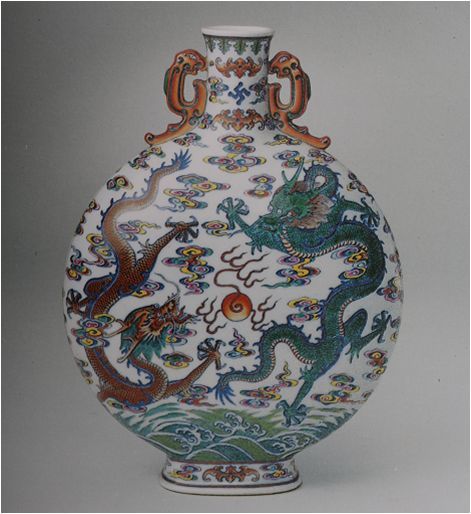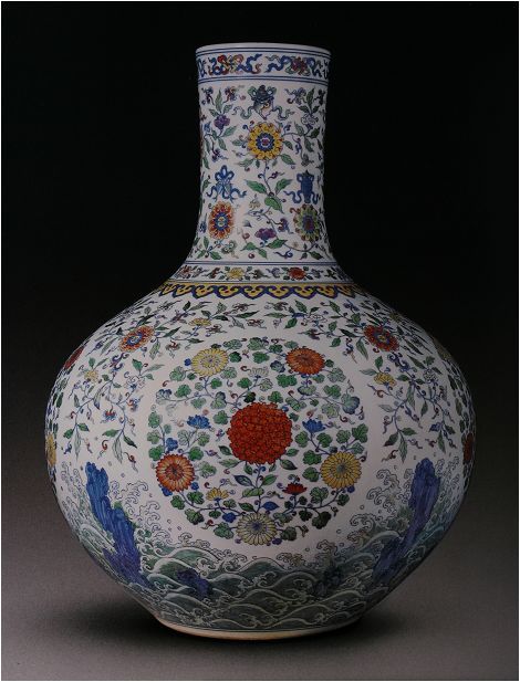 再说说清代的斗彩瓷器。康雍乾官窑有不少精品堪与成化斗彩媲美,清代的斗彩瓷器大多数绘画精致,改变了成化斗彩“叶无反侧”、“四季单衣”的不足,图案性更强,产量也要大于明成化时期,但没有成化斗彩清秀飘逸的风采。康雍乾官窑,都有一些仿成化斗彩的产品,特别是雍正时期,已能很好地仿烧出成化斗彩,但这些仿品大都署本朝年款或不落款,只有少数寄托成化款。您看观复展出的“康熙斗彩老子出关图莱菔瓶”,莱菔就是萝卜,还有北京故宫收藏的“雍正斗彩团花天球瓶”和“乾隆斗彩双龙纹抱月瓶”。
