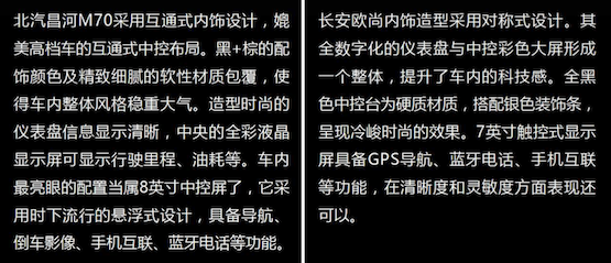 买车看配置,应该是常识。同为自主品牌,长安欧尚和北汽昌河M70在配置不分轩轾,但如果你关注细节,就会发现不同。长安欧尚的内饰造型采用全黑中控台+7英寸显示屏+全数字化仪表盘,整体看来冷峻时尚并富有科技感。而北汽昌河M70采用黑+棕的时尚双色配饰,仪表盘和液晶屏在信息显示上也更加清晰。而更抢眼的是位于中控台顶部的8英寸中控屏,不仅集成GPS、倒车影像等功能于一身,超大超清晰的屏幕显示也让驾驶者查看更加方便,让行驶更加安全。
