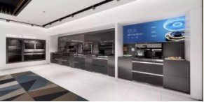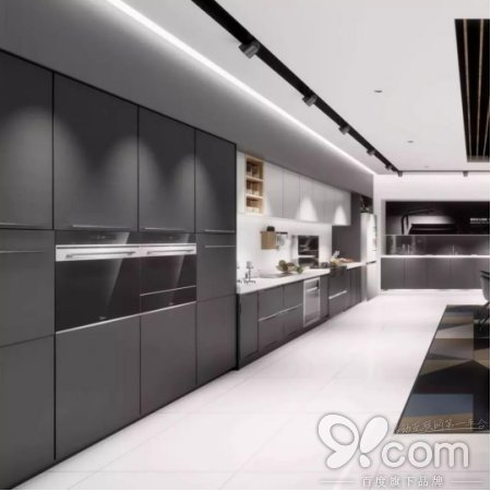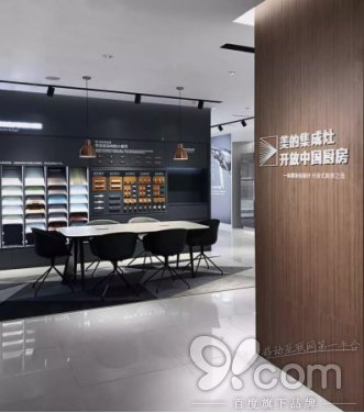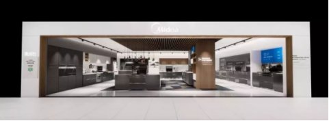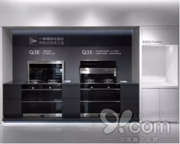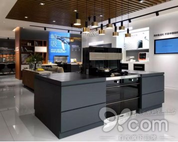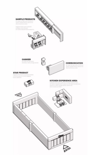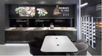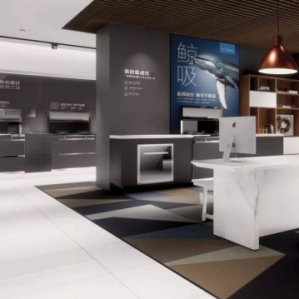 一字型店铺从两端进入,以集成灶为核心产品的集成式开放厨房配以洗碗机等其他嵌入式厨房电器,构成了两套完整的、形态与常规家庭厨房类似的厨房生态。
