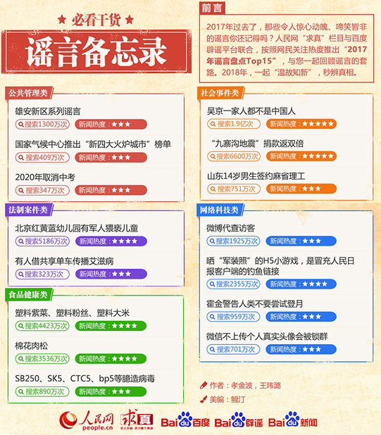 2017年过去了,那些令人惊心动魄、啼笑皆非的谣言你还记得吗?人民网“求真”栏目与百度辟谣平台联合推出年度盘点,跟小伙伴们一起回顾谣言的套路。希望在新的一年,如果再遇到这些谣言改头换面,大家都能慧眼如炬,秒辨真相。