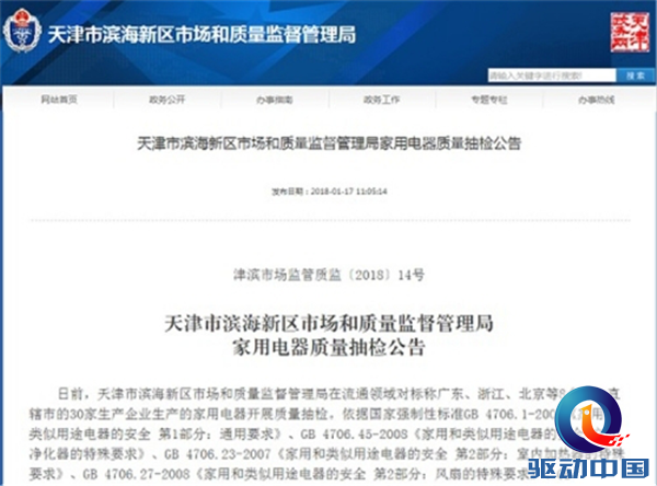 据了解,日前,天津市滨海新区市场和质量监督管理局按照流通领域重点商品抽检计划,重点对广东、浙江、北京等8个省、直辖市的30家生产企业生产的家用电器开展质量抽检工作。经检测,受检家用电器45个批次,合格40个批次,不合格5个批次,合格率为88.9%。