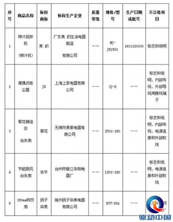 其中,标称商标美的MJ-JE25G1的榨汁搅拌机以及扬子华美KYT-25A的250mm转页扇不合格项目为标志和说明;标称商标JK SJ-6的便携式吸尘器的标志和说明、内部布线、外部导线用接线端子存在不合格问题;标称商标菊花XY01-180的迷你台夹扇存在标志和说明、内部布线、电源连接和外部软线等问题;标称华予LX01-180的节能微风台夹扇因标志和说明、电源连接和外部软线等问题而被判定不合格。