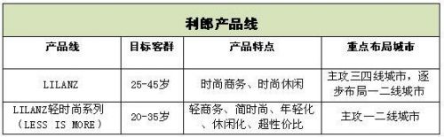 自 1987 年成立至今,“而立之年”的利郎已是一家集研发、设计、生产、零售于一体的综合时装企业。目前,利郎拥有 LILANZ 和 LILANZ 轻时尚系列(LESS IS MORE)两大产品主力线。LILANZ 针对 25-45 岁消费者,该系列产品在三四线城市深受欢迎,并逐步向一二线城市布局;LILANZ 轻时尚则布局一二线城市,重点针对 20-35 岁的年轻消费者,以时尚设计、丰富款式贴近都市年轻男性消费需求。\u00A0