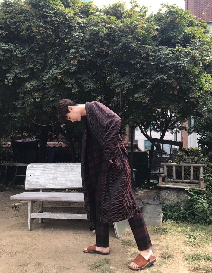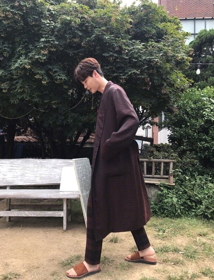 9月22日,李钟硕在微博上晒出一组自拍,他身穿长款风衣和拖鞋,悠闲漫步。