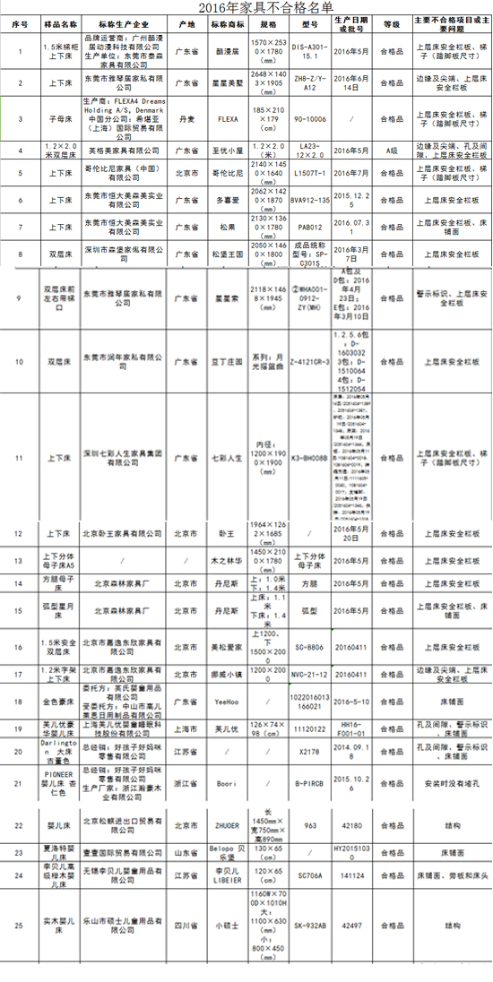 市工商局官网公布2016年流通领域类商品质量抽检结果,酷漫居、星星美墅、多喜爱等多个知名??此次发布的结果显示,北京市工商局对北京市场上销售的家具(上下床、婴儿床、木家具)类商品进行了抽检,抽检不合格的40种家具中,有28种都是儿童床家具(上下床、婴儿床)。??其中多个知名儿童家具的产品存在结构安全等问题。包括标称商标为“酷漫居”、标称生产单位为“东莞市泰森家具有限公司”、型号为“DIS-A301...