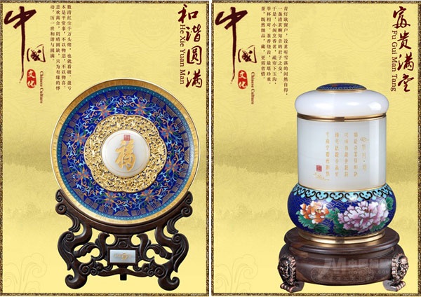 “制尊大师”是由玉石和景泰蓝工艺完美结合的现代工艺品, 它由艺术大师戴嘉林精心创作,600多位工艺美术师与工匠协作完成,由制胎、掐丝、烧焊、点蓝、烧蓝、磨光、镀金等168道传统皇家景泰蓝制作工艺外加60道现代纯手工工艺精琢而成,再融以 “爪镶”工艺,比传统景泰蓝更具鉴赏价值和收藏价值。