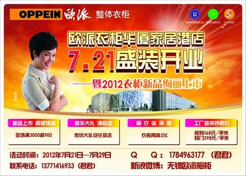 为庆祝欧派衣柜无锡华夏港店盛装开业,7月21-29日将举行开业优惠活动,四大惊喜期待您的到来。惊喜一:【新品上市震撼锡城】全场满3000减900,再送尊贵实木挂衣架(每户3套,每套2个)。惊喜二:【豪华礼包买就送】活动期间客户订购欧派衣柜金额满10000元,即加送价值2380元“富安娜家纺大礼包”一个。...