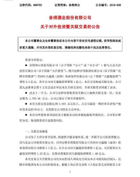 \u00A0\u00A0\u00A0\u00A06月20日晚间,舍得酒业(600702)发布公告称,拟斥资1亿元投资天赢链(深圳)商业保理有限公司,共同增资方还有四川沱牌舍得集团有限公司、北京天洋投资有限公司,合计增资额达3.5亿元。《金融投资报》记者注意到,舍得酒业2017年全年净利润为1.44亿元,此次跨界投资将花费其去年近70%的净利润,加之2017年舍得酒业未达营收目标,受到了市场诸多质疑...