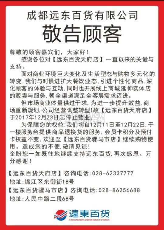 四川在线消息(记者赵张冬)远东百货天府店将于12月23日起停止营业。11月21日,成都远东百货有限公司发布的新闻稿称:“面对商业环境巨大变化及生活型态与购物多元化的转变,我们与时俱进扩大餐饮业态,引进个性化商品,深化顾客的体验与互动,同时也开展线上商城延伸实体店的贩卖与服务,朝全渠道满足全客层需求迈进。但市场商业体量供过于求,为进一步提升效益,商场重新规划,公司经营调整转型!故[远东百货天府店]决...