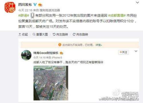 (原标题:成都市民因雾霾聚集天府广场?官方回应:谣言)四川省人民政府新闻办公室官方微博截图。中新网12月10日电据四川省人民政府新闻办公室官方微博“四川发布”消息,有部分网友用一张2012年就出现的图片来造谣因成都雾霾市民纷纷聚集到成都天府广场,四川省人民政府新闻办公室表示,对发布该不实信息内容的账号予以扣除信用积分10分,禁言15天,禁被关注15天的处罚。(原标题:成都市民因雾霾聚集天府广场?官...