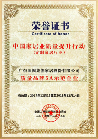 顶固全屋定制获中国家居业“质量品牌5A级示范企业”称号