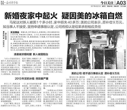 本报四月二十一日A03版报道了马尾这户居民新婚夜家中起火东南网6月1日讯(海峡都市报记者刘世泉)今年3月11日,是家住福州马尾君竹佳园陈先生大喜的日子,可谁也没想到,12日凌晨,婚房突然起大火,家里被烧得一片狼藉。事后,陈先生查看现场,怀疑是家中的美的冰箱自燃起火,遂向美的公司提出赔偿。近日,陈先生拿到了福州市马尾公安消防大队出具的“火灾事故认定书”,根据认定书,起火原因系冰箱内部电器线路短路引起...
