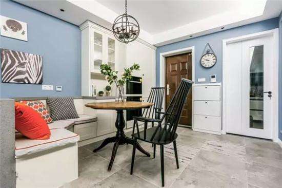 大门这里的功能很丰富啊,有鞋柜、收纳、餐厅!鞋柜放在大门与厨房中间的位置,小小的,不会占用很多空间。另一边做了顶天立地的收纳柜,并将一部分厨房电器也收到这里。餐厅则是卡座与餐椅的组合,中间放张圆形小餐桌,美观又实用。卡座不仅好看,而且收纳能力也很棒。在上面摆上柔软的坐垫和舒适的抱枕,再来点鲜艳的花朵,温馨感爆棚!白色为主的厨房,看起来干净又明亮。烹饪区的墙面用不同图案的花砖组合在一起,充满了趣味性...